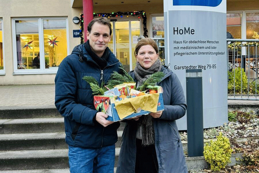 Kurz vor Weihnachten waren wir wieder unterwegs, um uns bei Menschen und Einrichtungen zu bedanken, die wichtige Arbeit in unserem Stadtteil leisten und die über die Weihnachtstage im Einsatz sind. Der Weg führte uns dabei u. a. erneut zur Unterkunft für pflegebedürftige Wohnungslose am Garstedter Weg, wo wir einen Präsentkorb